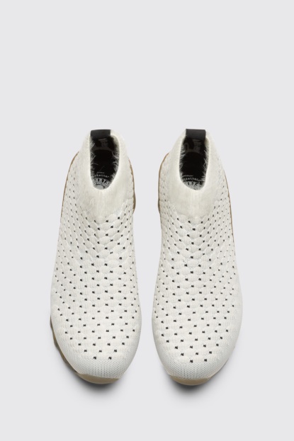 Ženski Beli športni škornji S Cikcakastimi Podplati. Nemški Modni Oblikovalec Bernhard Willhelm Se Vrača Na Praznovanje 10. Obletnice Himalayana, Njegovega Značilnega Sodelovanja Together Z Nepričakovanimi Obdelavami In Edinstvenim Cikcakastim Podplatom.