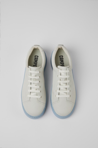 Bele In Modre Nebarvane Usnjene ženske Superge Z Odstranljivimi Vložki OrthoLite® Recycled™ In Zunanjimi Podplati XL EXTRALIGHT®. Runner Up Je ženska Različica Runnerja, Ikoničnega Sloga Camper, Predstavljenega Leta 1982, Ki Je Zaznamoval Naš Prvi Korak V Svetu športa. Te ženske Superge Nudijo Sproščen Videz In Subtilno Peto S Platformo V športni Silhueti, Ki Jo Navdihuje 80.