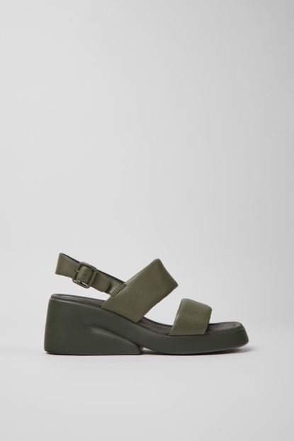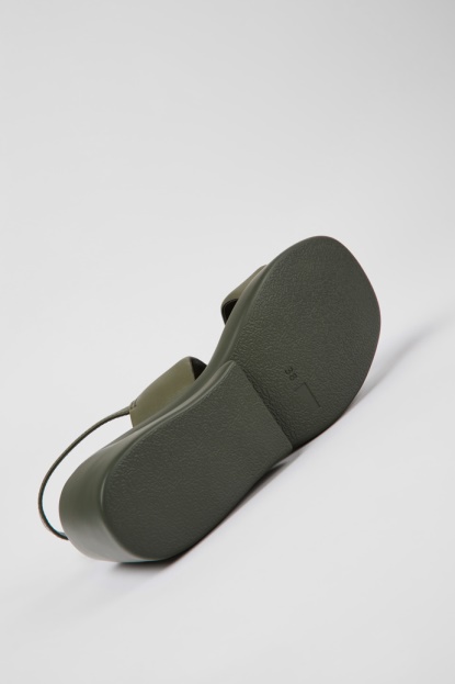Zeleni Usnjeni ženski Sandali Z Neodstranljivimi Vložki OrthoLite® Recycled™ In Zunanjimi Podplati Iz PU. Z Drznim, Sodobnim Dizajnom, Ki Sta Ga Navdihnila Futurizem In Brutalizem, Naši Sandali Kaah Dokončajo Igriv Pridih Avantgardnemu Slogu.