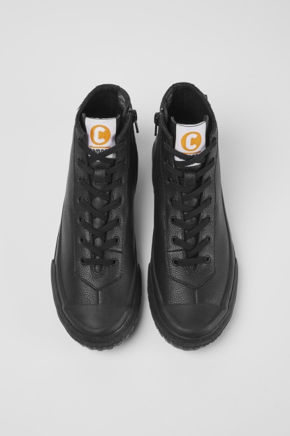 Črni Usnjeni ženski škornji S Podplatom Iz 23 % Reciklirane Gume In 40 % Naravnega Kavčuka. Camaleon Je Camperjev Prvi čevelj V Zgodovini In Pooseblja Preprostost In Iznajdljivost Njegove Sredozemske Dediščine. Navdahnjena Z Rustikalnimi čevlji, Ki So Jih Nosili Pred Več Kot Stoletjem, Je Ta Linija Postala Ikona Camperja In Izraža želja Po Bolj Obzirnem Načinu Hoje. Za Vsak Prodan Par Camaleona Bomo Dali 1 % Organizaciji Save The Med, Množični Organizaciji Prizadevanje Za Regeneracijo Sredozemskega Morja Z Izobraževanjem In Pomorskimi Projekti.