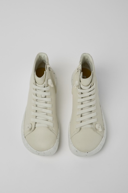 Beli Usnjeni ženski Gležnjarji Z Recikliranimi Elastičnimi Vezalkami In Podplati Iz 51 % Recikliranega EVA. 1 % Od Prodaje Teh čevljev Bo Namenjen Okoljskim Namenom. Peu Stadium Je Prenovljena Različica Ikoničnega Peu Camija S Sodobnim Pridihom In Drznejšim Volumnom. V Sodoben Videz.