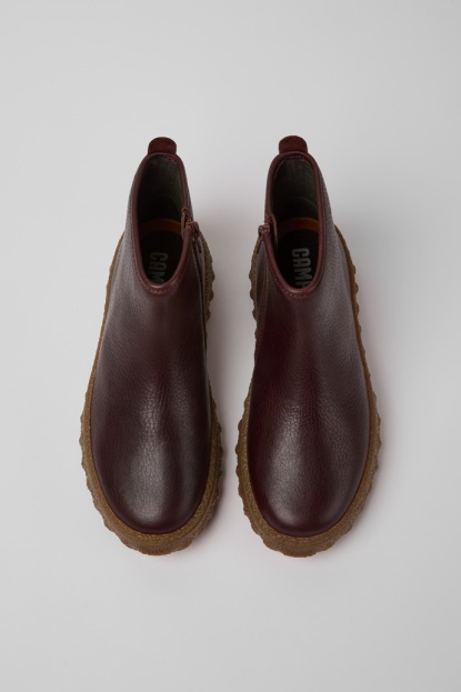 Ženski Gležnarji Iz Borda Rdečega Usnja S Podplati Iz 27 % Naravnega Michelinovega Kavčuka. Ground Na Novo Predstavlja Urbani Ulični Stil Z Dodajanjem Sodobnega Pridiha Industrijskemu Camper Estetiki. Debel Zunanji Podplat Ima Naravno Gumo, Ki Zagotavlja Odličen Oprijem.