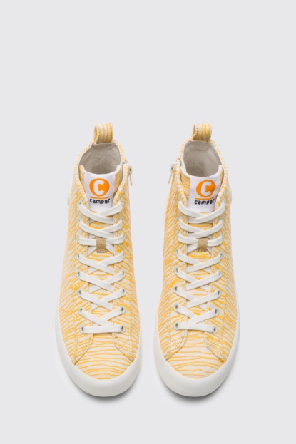 Večbarvni ženski škorenj. Bež In Rumen Zgornji Del Iz 100% Naravnega Bombaža, Z Vezalkami. Podplat Iz 100 % Bele Gume. Naš Imar Copa Je Reinterpretacija Klasike, Povišana S športno Nadgradnjo.