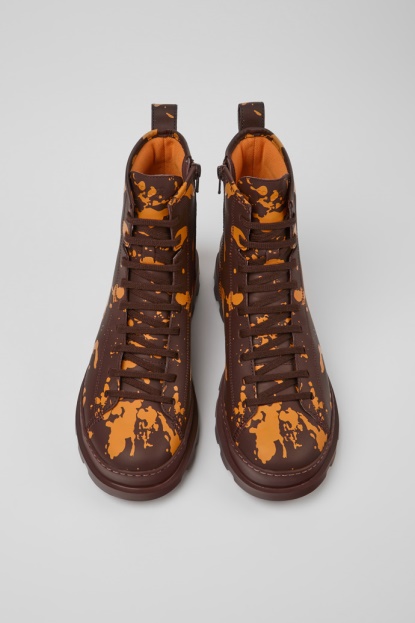 Usnjeni Moški Gležnarji V Bordo Barvi In Oranžni Barvi S Potiskom Brizganja Barve, Vložki Iz PU In XL EXTRALIGHT Podplati. Originalni Camper Iz Leta 1986 Z Ikoničnim Urbanim Dizajnom. Brutus Je Vzdržljiv Zahvaljujoč 360' šivu In Ima Lahko Tehnologijo.