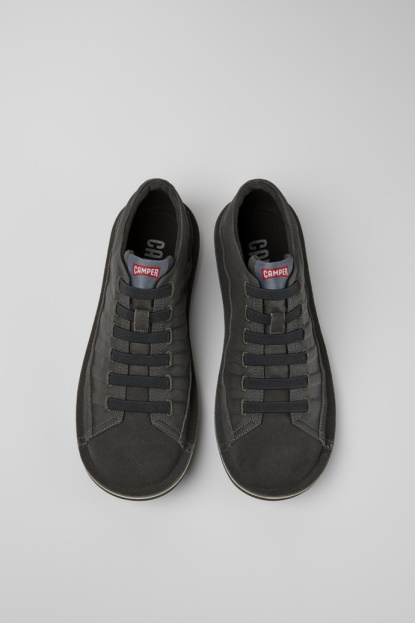 Moške Temno Sive Superge. Tekstil In Nubuk Usnje. Ikona Kamperja, Ki Se Razvija Z Vsako Sezono, Naši Moški čevlji Beetle So Lahki In Prilagodljivi, Z Zapečateno Konstrukcijo, Ki Združuje Anatomsko Obliko Z Izvirnim Dizajnom.