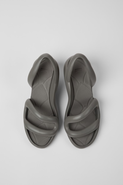 Sivi Uniseks Sandali S Podplati XL EXTRALIGHT® Organix™ (30 % Sladkornega Trsa Iz Biološkega Izvora). Kobarah Je Bil Zasnovan Tako, Da Se Ovije Okoli Stopala, Navdihnjen Z Oblinami Kače. Izdelan Iz Materialov, Ki Jih Je Morda V Celoti Reciklirati, Njegova Zaobljena Oblika In široka Peta Končata Edinstven Sandal S Peto Ležerne, A Sodobne Estetike.