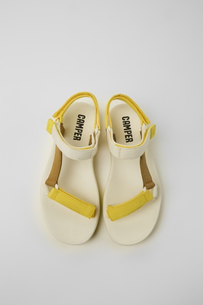 Rumeni, Beli In Rjavi ženski Sandali S 100-odstotno Recikliranimi PET Paščki, EVA Podplati In Sistemom Zapiranja Na Kljukico In Zanko. Naš Sandal Match Je Dokaz Udobja In Preprostosti Dizajna S Pasovi, Ki Se Enostavno Prilegajo Iz 100-odstotno Recikliranega PET-a, In Lahkim Podplatom.