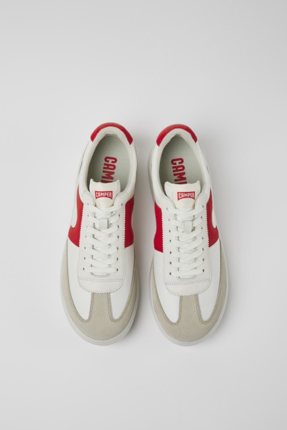 Bele In Rdeče Tekstilne In Usnjene Moške Superge Z Odstranljivimi PU Podplati In EVA Podplati. S Posodobljeno Obliko In Mehkim Podplatom Naše Izboljšane Pelotas XL Predstavljajo Nov Pristop K Urbani Obutvi.