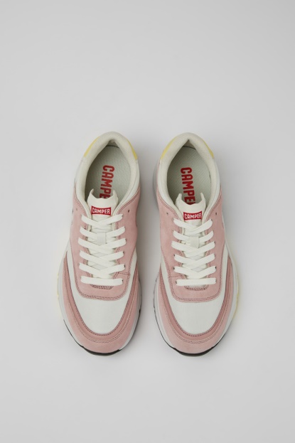 Bele In Rožnate ženske Superge Iz Recikliranega PET In Nubuka S PU Vložki In Podplati Iz 70 % EVA In 30 % Gume. Naše Superge Drift Se Ponašajo Z Lahko Konstrukcijo In Športno Silhueto Po Navdihu Atletskih Copat Iz 90. Let.