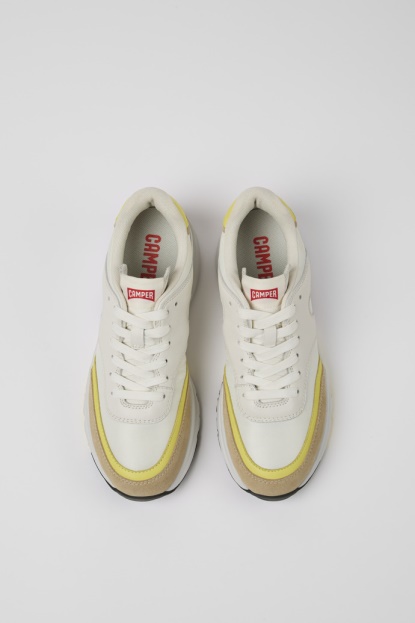 Ženske Superge Iz Recikliranega PET In Usnja V Beli In Bež Barvi S PU Vložki In Podplati Iz 70 % EVA In 30 % Gume. Naše Superge Drift Se Ponašajo Z Lahko Konstrukcijo In Športno Silhueto Po Navdihu Atletskih Copat Iz 90. Let.